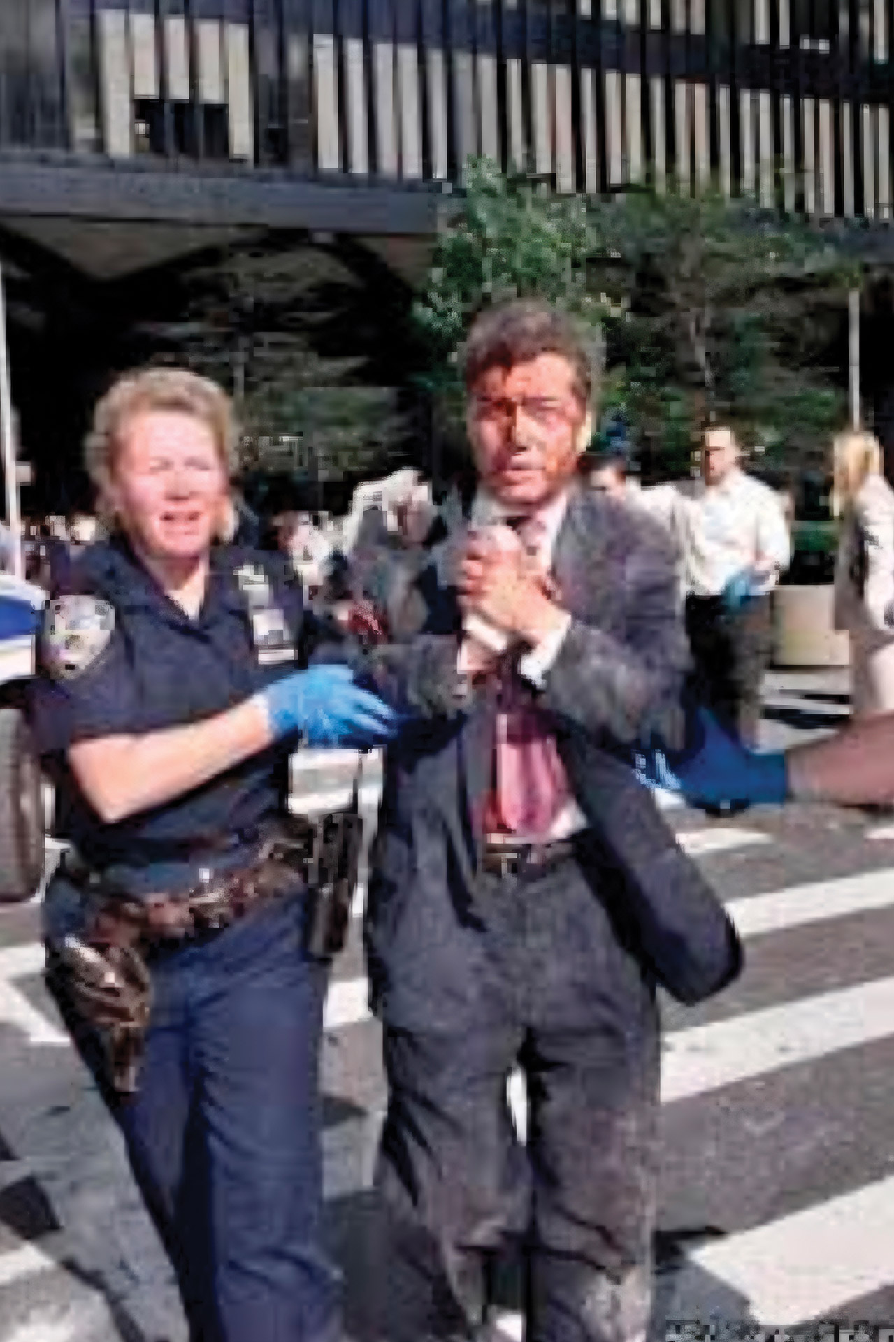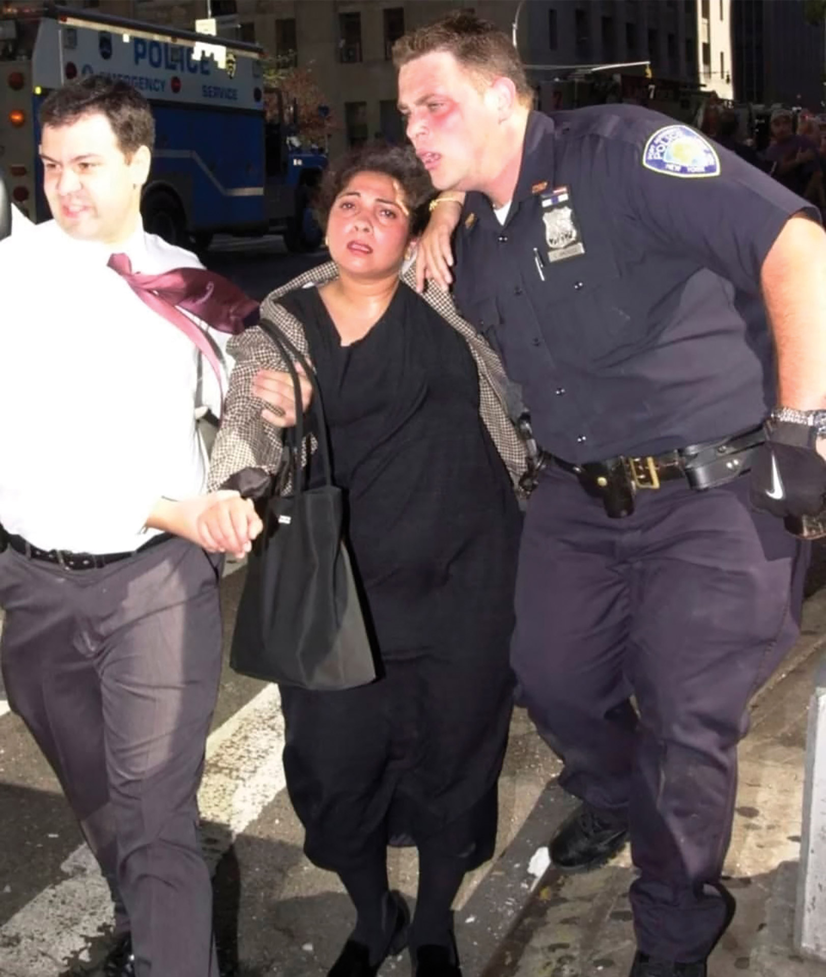 There were many incidents of first responders guiding people out of the Towers, returning in the hope of saving more and not surviving their heroic efforts. Port Authority Police Officer Christopher Amoroso, who was a 29-year-old, two-year PAPD veteran, and 38-year-old New York City Police Officer Moira Smith, who served 13 years with the NYPD, were captured in iconic photographs by New York Daily News photographers Todd Maisel and Corey Sipkin that showed both officers rescuing people, only to return to the Towers to attempt further rescues. They perished putting others before self. Both left behind their spouses and toddler daughters.